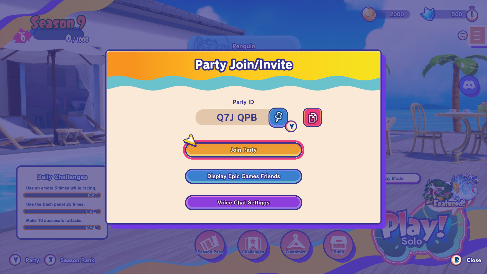 On the Home screen, press the button below to open the Party Join / Invite screen in a pop-up window.