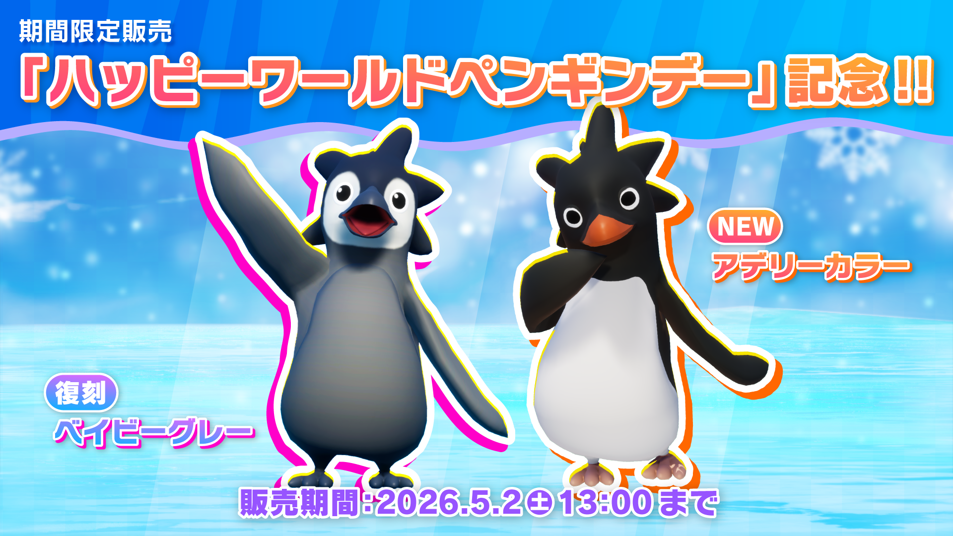 2026.04.20 ワールドペンギンデーを記念してアイテムを販売! SHARE ハッピーワールドペンギンデー! 世界ペンギンの日を記念して、カラー「アデリーカラー」が登場! さらに過去に登場したカラー「ベイビーグレー」が復刻! どちらもクリスタルで購入可能です。 販売期間:4/25(土) 13:00~ 5/2(土) 13:00 お見逃しなく! ※本イベントおよびアイテムは、将来的に再登場する可能性があります