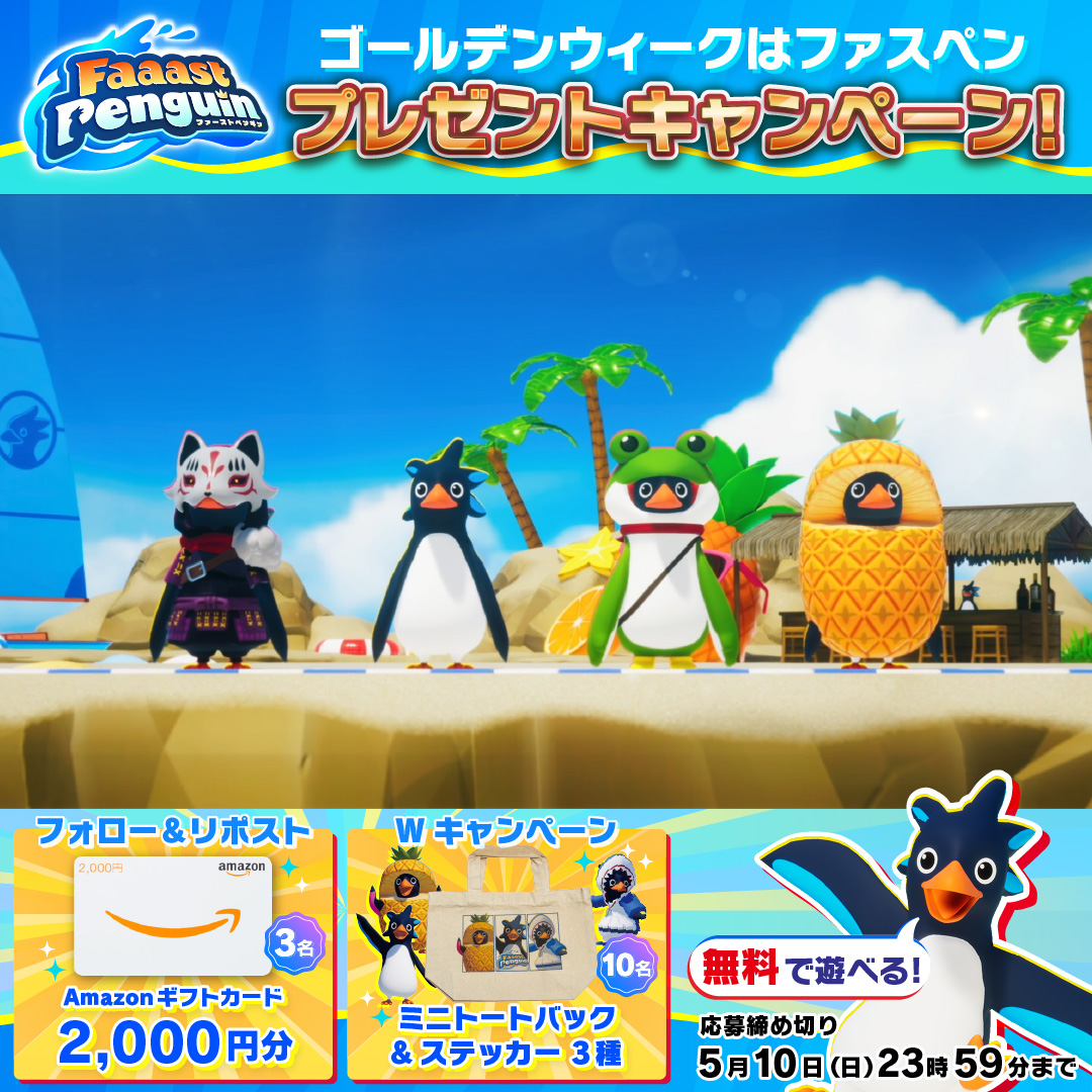 ゲーム内イベントに合わせて、『Faaast Penguin』のグッズがもらえるプレゼントキャンペーンを実施します。ぜひご参加ください!