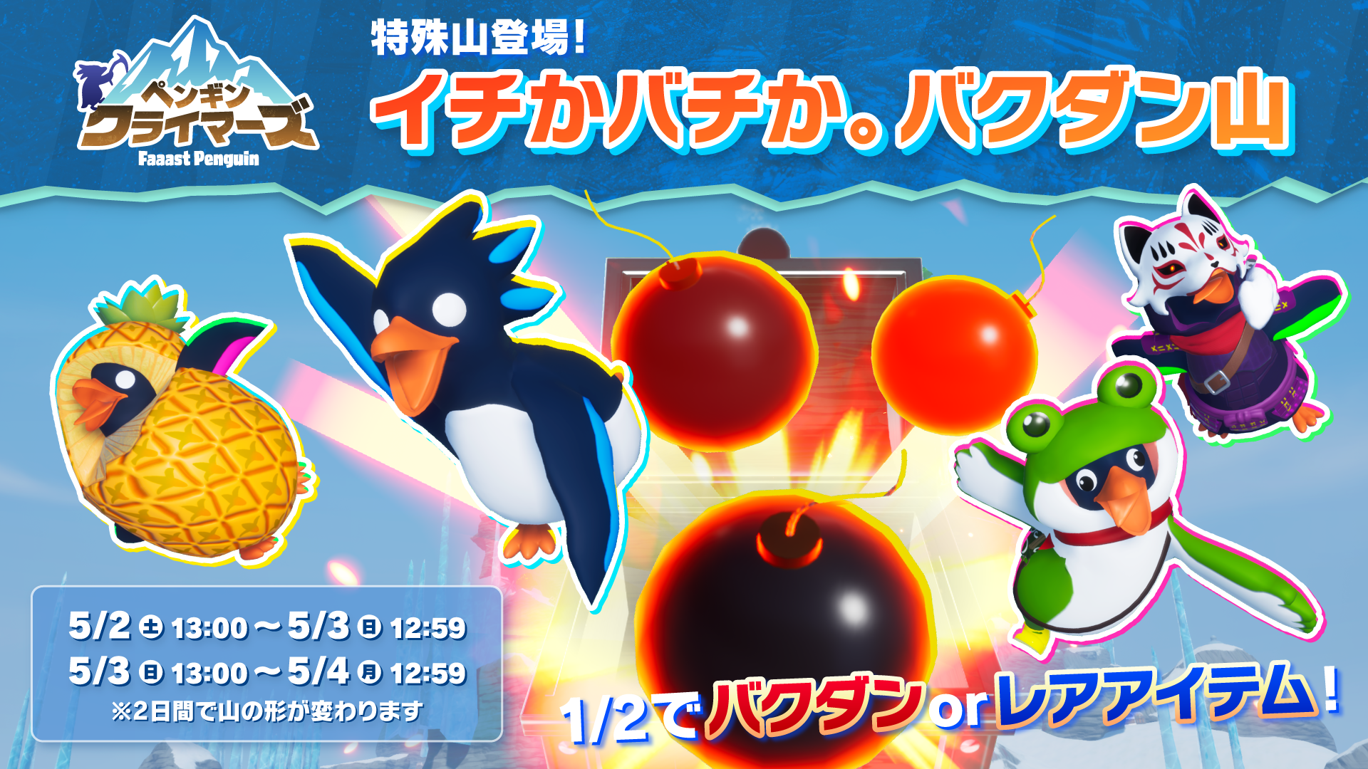 2026.04.21 特殊山が期間限定で登場!イチかバチか。バクダン山【ペンギン・クライマーズ】 SHARE 期間限定でエニグマ諸島が特殊な山に…!? 宝箱を開けると、1/2の確率でバクダンが飛び出るかアイテムが手に入ります。 手に入るアイテムも、レアアイテムになる確率がアップ。 ハイリスクハイリターンな宝箱に挑め! 期間 5/2(土) 13:00 ~ 5/3(日) 13:00 5/3(日) 13:00 ~ 5/4(月) 13:00 ※2日間で山の形が変わります