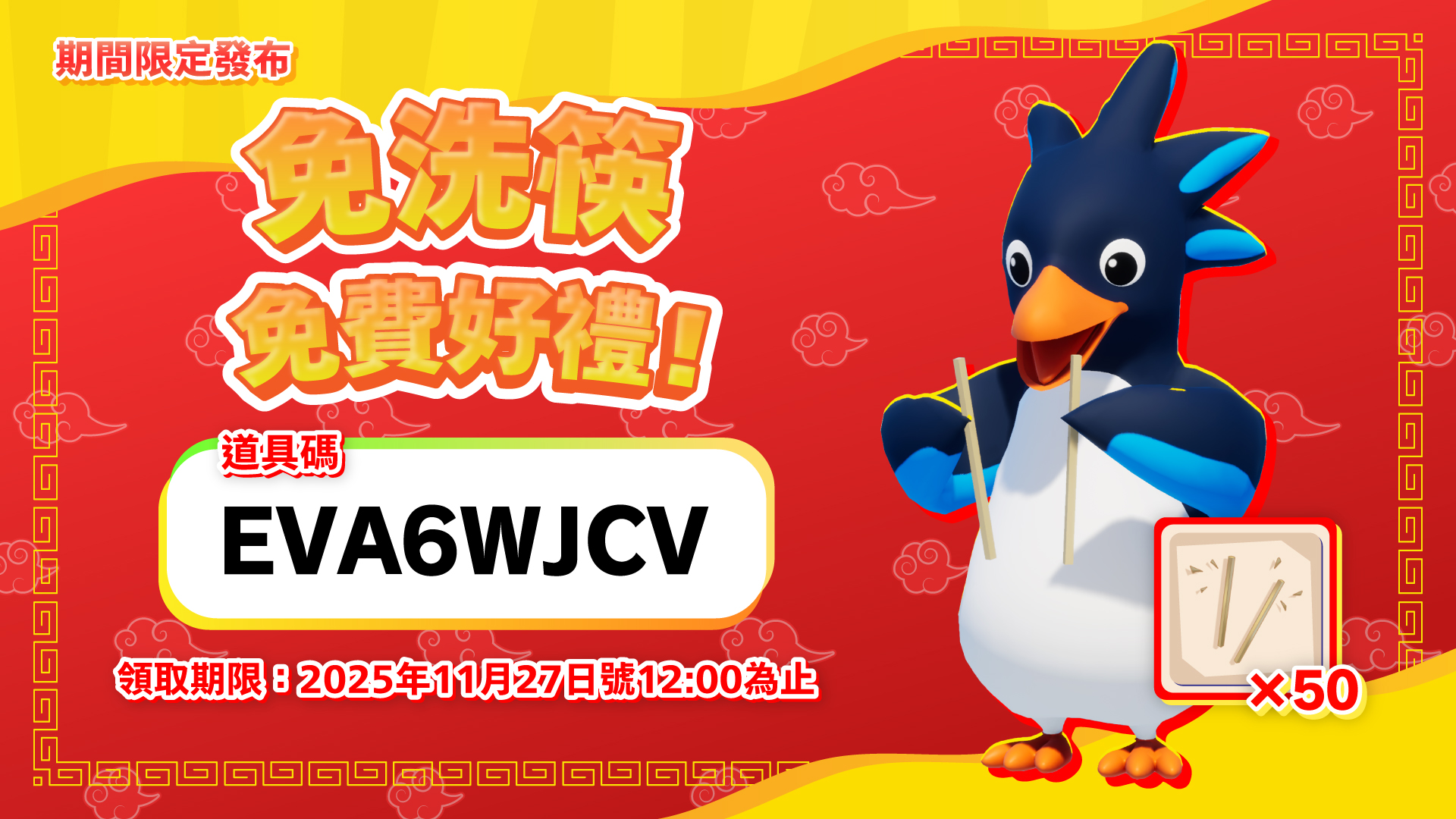 2025.11.17 期間限定發布「免洗筷」免費好禮! SHARE 贈送可在遊戲內使用的「免洗筷」各50個! 任何玩家只要於活動期間內輸入此道具碼即可領取。請務必換取道具並使用看看! 道具碼: EVA6WJCV 領取期限: 2025/11/27(四) 12:00(CST)止