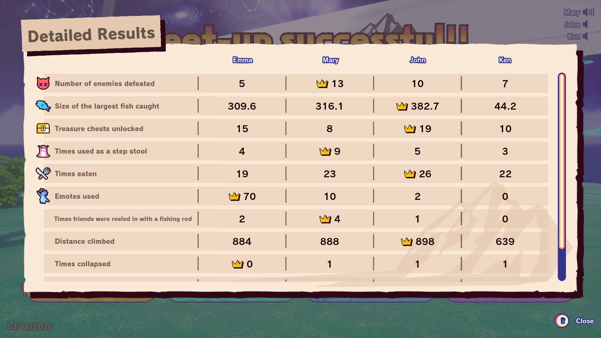 In the results screen, crowns are awarded to the players who contribute the most in each category.