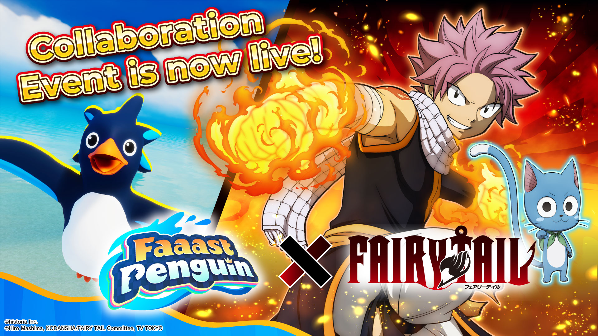 FAIRY TAIL takes over the world of Faaast Penguin!We’ll have you penguins fulfill various quests as members of the Fairy Tail mage guild.Acnologia attacks during a tour?!Enjoy a variety of events, including a co-op event where everyone works together to defeat enemies, and challenge events completing guild quests!Many customizable items like exclusive costumes, ultimate rides, emotes, consumables, and nameplates will drop!