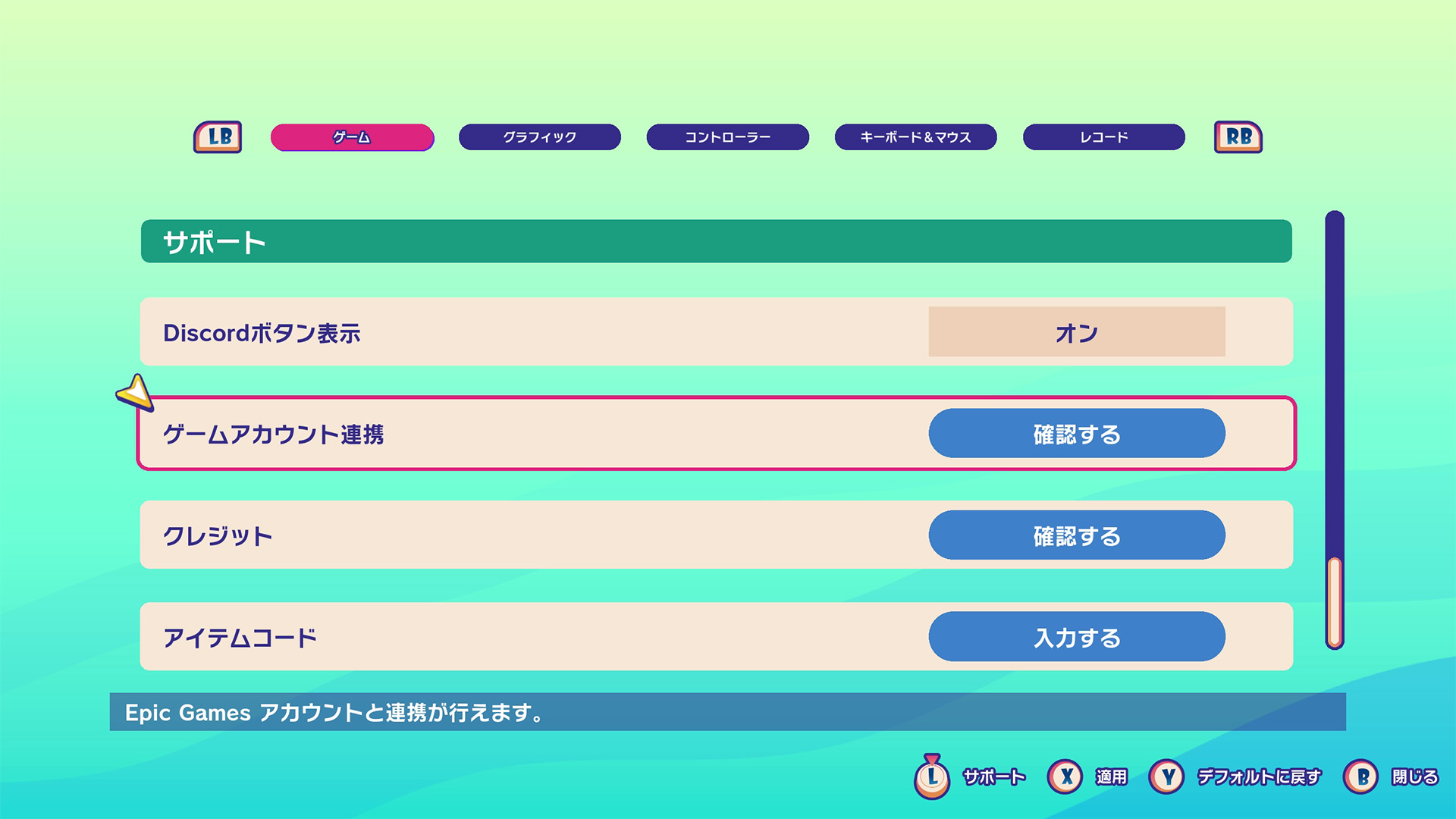 Epic Gamesアカウントとの連携は、「設定&サポート」画面の「ゲームアカウント連携」から行えます。