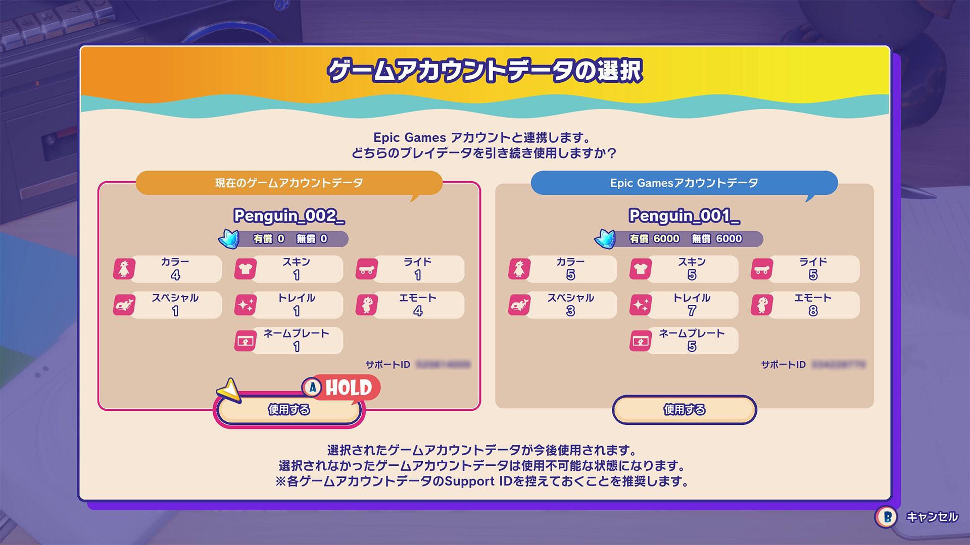 選択しなかったゲームデータにはログインできなくなる為、注意して選択してください。