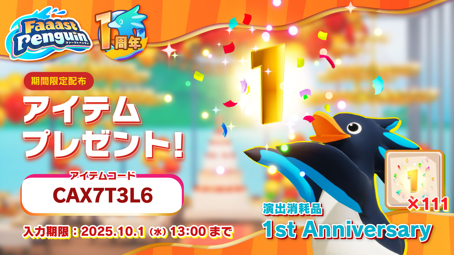 ゲーム内で使える消耗品「1st Anniversary」を111個プレゼント! 本コードは期間中すべてのプレイヤーがコードを入力することで獲得可能です。ぜひゲットしてアイテムを使ってみてください!