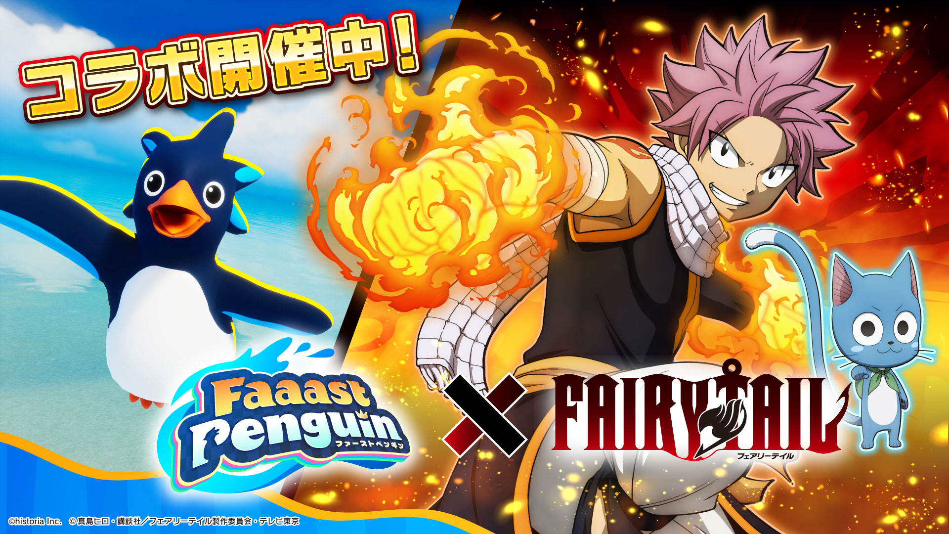 『FAIRY TAIL』が『Faaast Penguin』の世界をジャック! ペンギンの皆さんには魔導士ギルド「妖精の尻尾」の一員としてさまざまな依頼をこなして貰います。 ツアー中に、アクノロギア襲来!? 全員で討伐を目指す協力型イベントや、ギルドからの依頼をこなすチャレンジイベントなど盛りだくさん! 限定スキンやスペシャルライド、エモート、演出消耗品、ネームプレートなどのカスタマイズアイテムも多数登場!