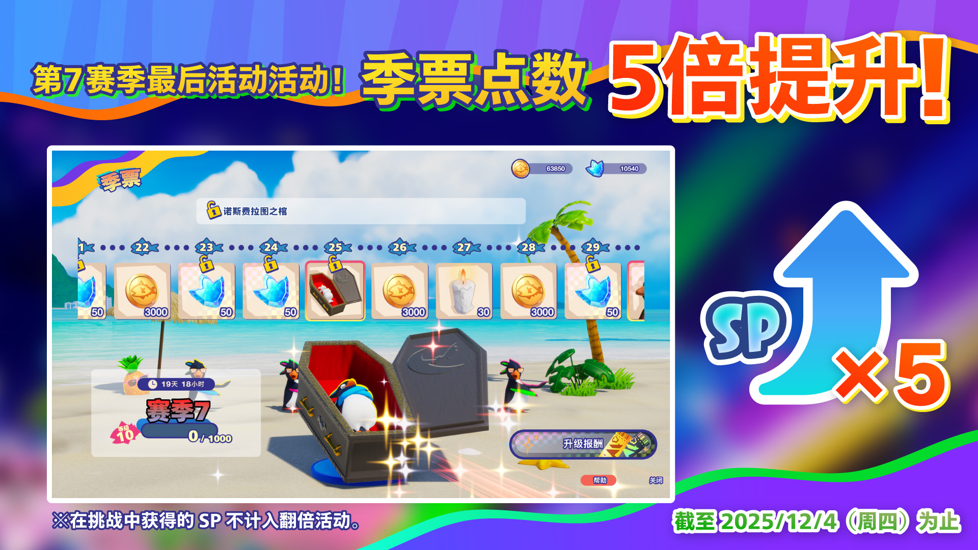 2025.11.26 将推出季票点数5倍活动即将推出! SHARE 11/28 (周五) 12:00 CST – 12/4 (周四) 12:00 CST期间,可获得的季票点数翻至[5倍]! 晚到玩家的绝佳机会! 在第7赛季结束前多多游玩、将道具多多收入囊中吧! ※在挑战中获得的SP不计入翻倍活动。