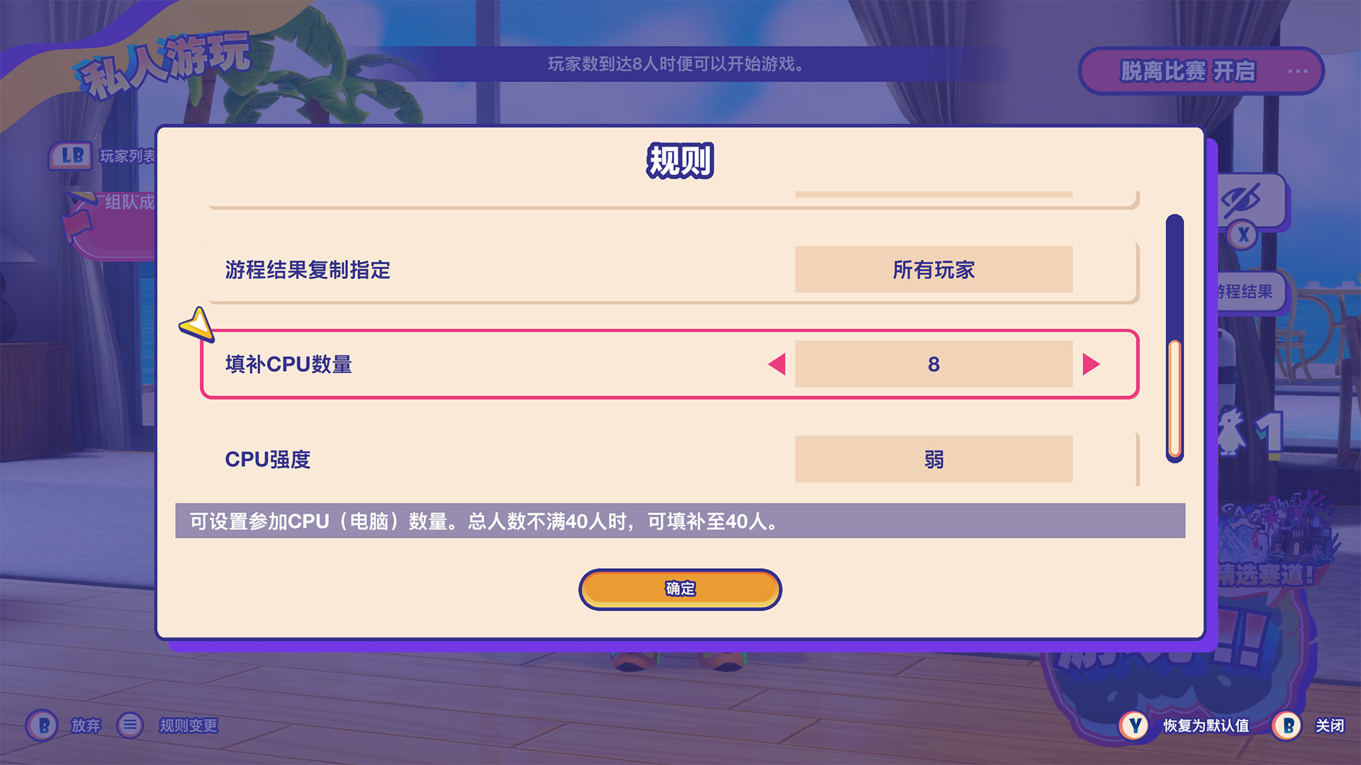 - 私人游玩中新增将“复制巡回赛结果”权限切换为“仅限房主”的设置