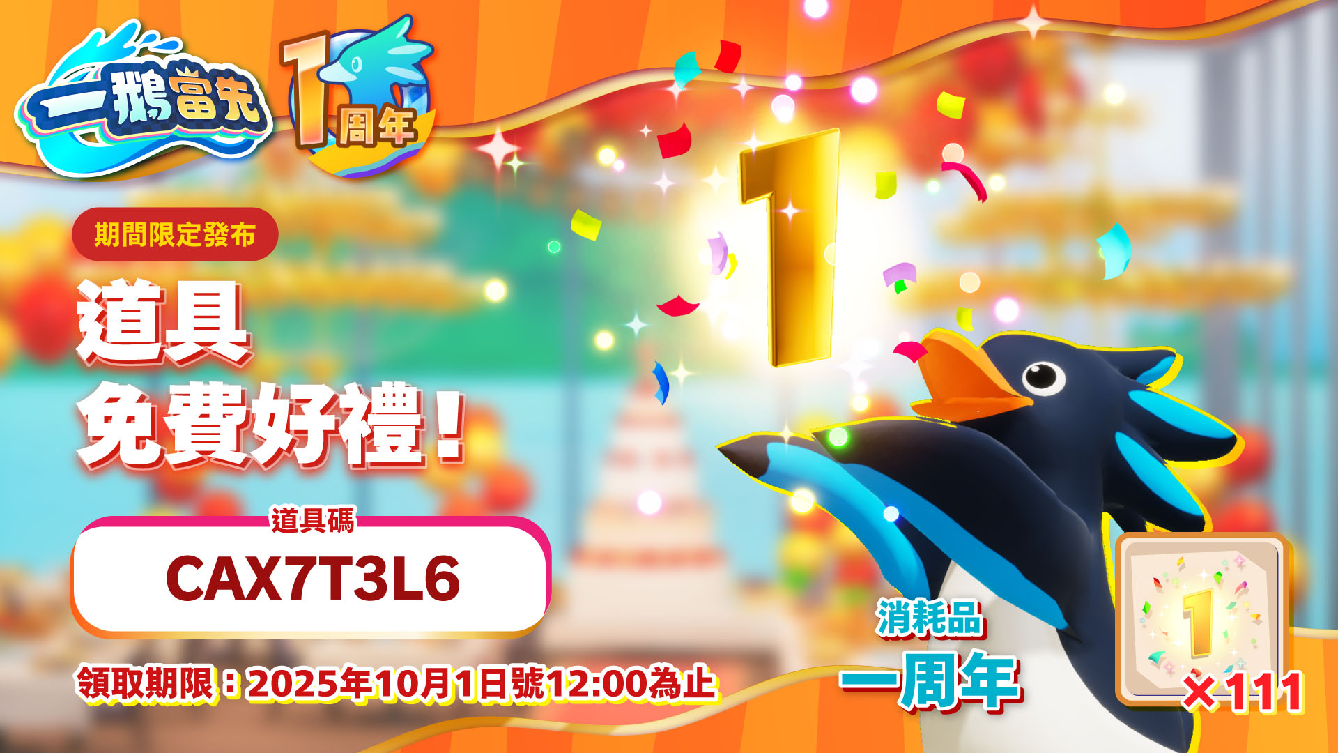 贈送111個可在遊戲內使用的消耗品「一周年」! 任何玩家只要於期間內輸入此道具碼即可領取。請務必換取道具並使用看看!