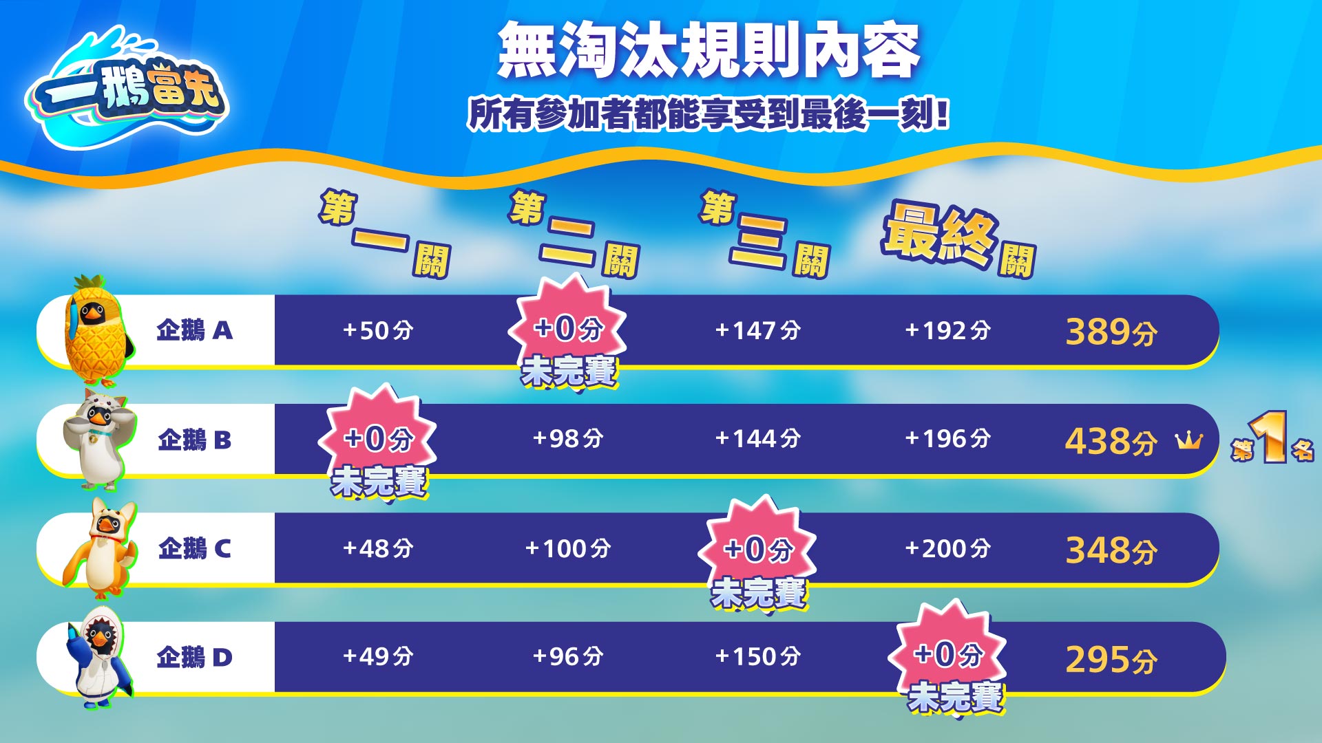 - 無淘汰規則:結果中排名位於前60%的玩家皆可獲得